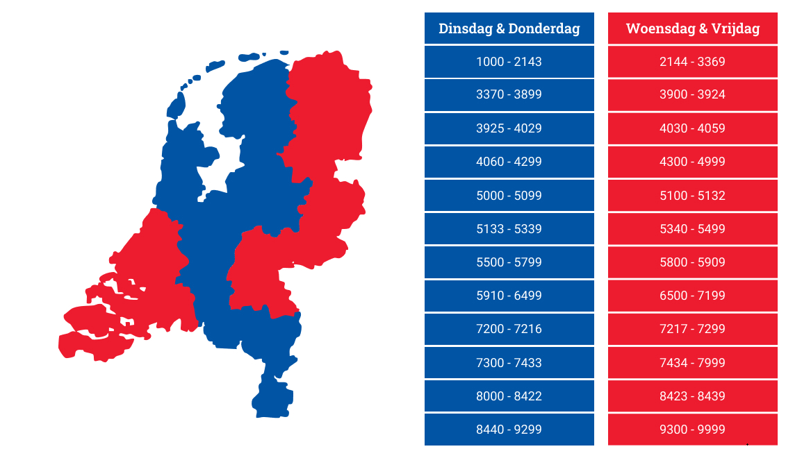 Wij werken samen met NE DistriService voor de levering van onze producten. Zij leveren volgens een vaste postcodeplanning. Dat betekent dat elke regio op vaste dagen wordt beleverd.