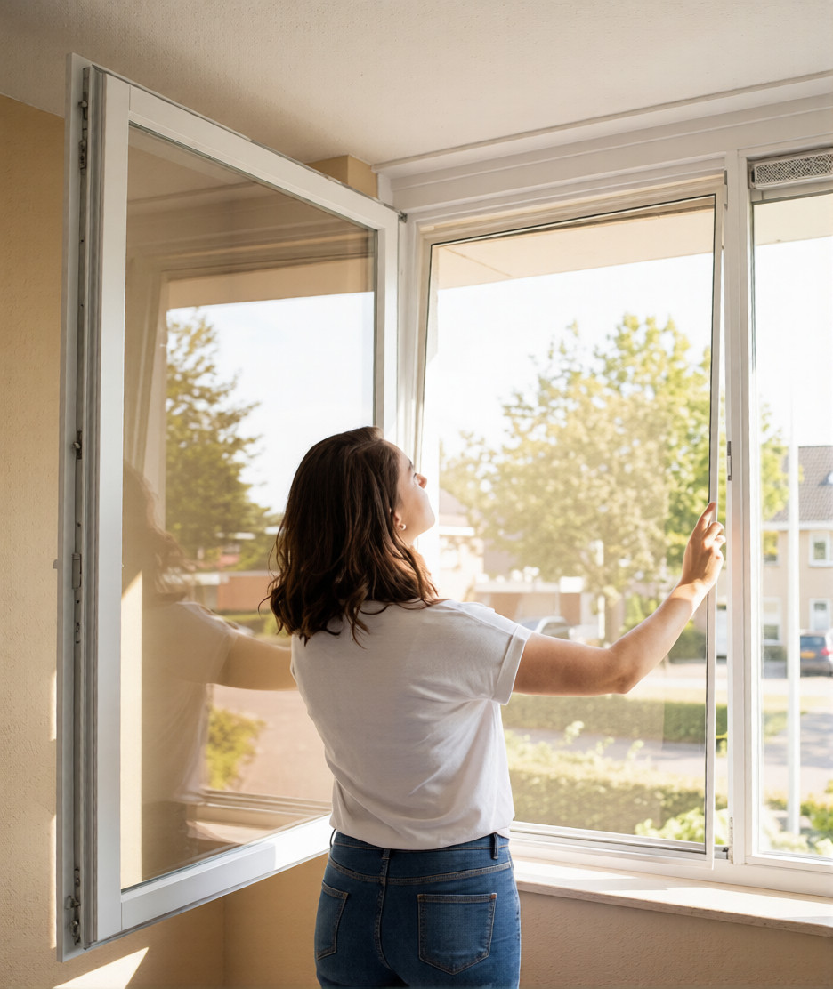 Plaatsen is eenvoudig. Je klikt het frame van binnenuit in het kozijn en hebt daarbij geen gereedschap nodig. Zodra hij op zijn plek zit, kun je het raam gewoon openen en sluiten zoals je gewend bent. Ventileren blijft dus net zo makkelijk als zonder hor.